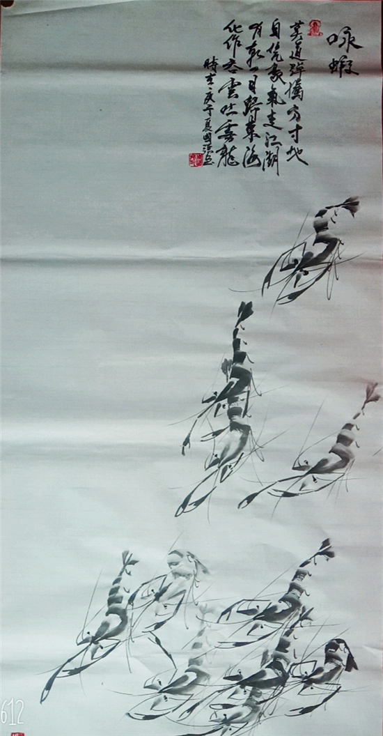 当代中国画坛,能将虾的形态描绘得活灵活现又独具韵味,周国强先生能算上一位。笔墨浓淡相间,虾的“须”看上去刚劲中透着飘逸、虾趣十足;画风清新淡雅、天趣横生; 笔墨雄浑滋润,色彩浓艳明快;造型简练生动、意境淳厚朴实,展现出了其深厚的国画功底。
