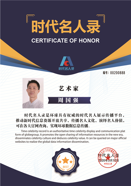 周国强,号欢溪山人,和合居士,1972.1月出生,浙江台州人,现为世界华人慈善协会台州分会副会长,中华周氏濂溪商会联盟执行主席,中华国礼艺术家,国家一级美术师,华港书画研究院理事,宣和书画艺术研究院副院长,2017年被评为中国金奖画家,2018年被评为最具影响力书画大师。2018年6月作品参加世界华人书画展,得到日本等外国友人好评,第十三届全国人大二次会议全国两会重点推荐人民艺术家,2019年5月受邀参加国际画展,受到原外交官马志学马部长接见,2019年作品登录在采风中国月刊,2020年作品被选中国黄金诗词文大典,曾受到第十二届人大常委副委员长陈昌智及中央候补委员全国妇联副主席宋鱼水女士的接见及颁奖。