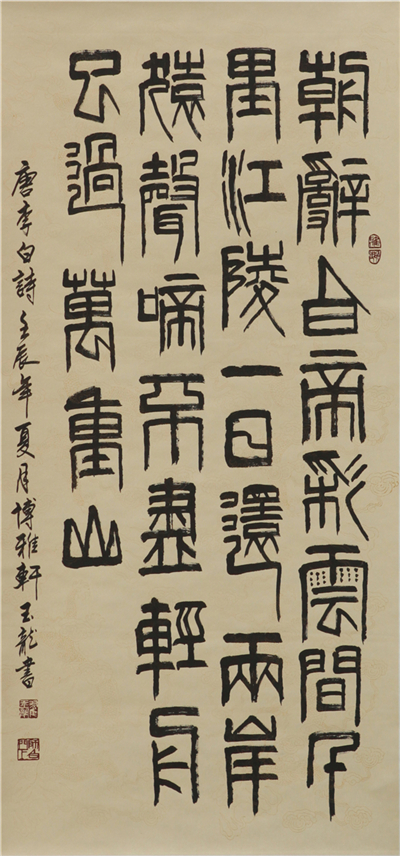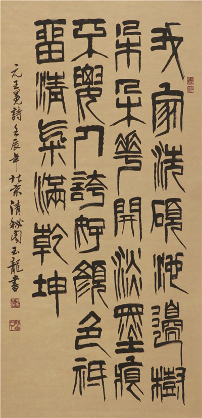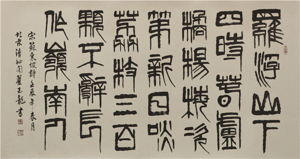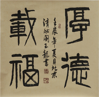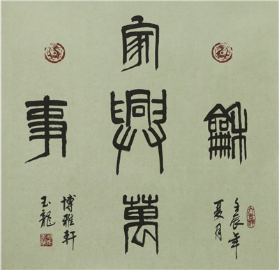 翟玉龙的篆刻与书法的学习几乎同步,相互影响,相互转换,达到“书以入印,印从书出”的效果。“笔有意,善用意者,驰骋合度;刀有锋,善用锋者,裁顿为法。”---明程远《印旨》,能够映射出书法与印章的关系以及两者之间所形成的潜移默化的关联度。以致他的篆书书法作品同样沿袭齐派风格,苍劲大气,与印章相得益彰,摆脱了近代某些名家所谓的探索先锋印章艺术所遗留的匠人之气,开启正真大匠之门风范。